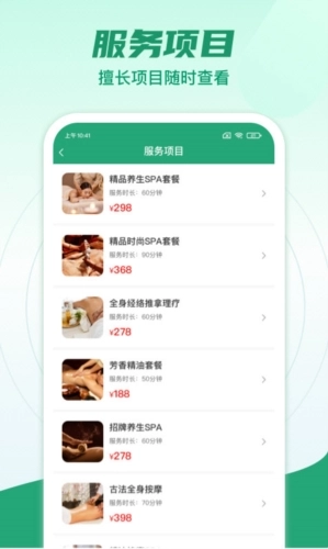 项目管理:涵盖刮痧、中式按摩、头颈肩按摩等多种项目,通过“点到技师端”能够对可提供服务的项目进行管理。
