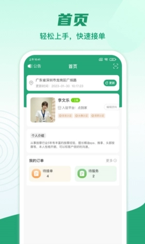 点到家接单凭借直观的界面和强大的订单管理系统,让我在忙碌的工作中找到了秩序感与自由度。我发现它的订单通知系统十分及时,能确保我不错过任何一笔生意,这大大提升了我的工作效率。点到家接单不仅完全免费,设计还简洁大方,使用时让人心情舒畅。自定义接单时间和项目管理功能,让我可以灵活平衡工作与个人时间,这在服务行业里实属难得。订单详情页面清晰明了,能让我快速掌握服务要求,而详细的按摩订单数据则帮助我追踪收入情况,规划职业发展方向。它是一款为技师量身打造的专业工具,凭借高效、安全且用户友好的特点,成为了我在按摩服务行业的得力帮手。我强烈推荐给同行们,让我们一同体验这款应用带来的便捷与专业。