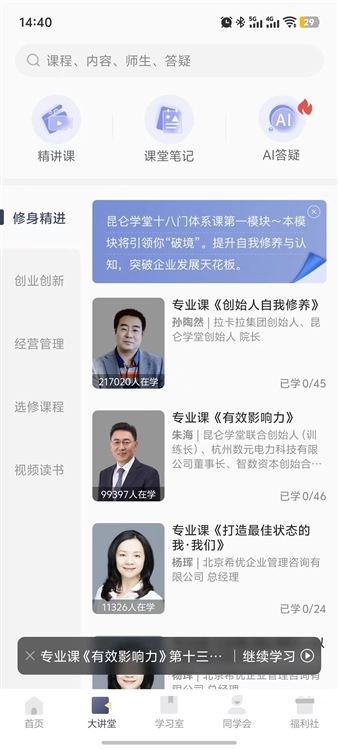在课程库页面,您可以按照修身、创业、经营这三个类别来筛选课程。当您点击课程封面后,就能查看课程的详细信息,并且可以将该课程添加到“我的课程”中。
