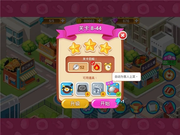 以8-44这一关卡为例,玩家可以借助“上菜小助手”来减少操作压力——当发现食材或菜品不足时能及时补充制作,而上菜的环节则完全可以交给这个助手负责。