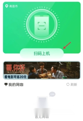 打开趣网咖扫码上机软件并进入首页后,点击页面上方的“扫码上机”按钮。