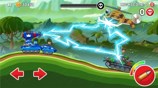 首先,这款游戏的操作十分简单:左下角负责控制方向,右侧是射击按钮,头顶的绿色血条代表自己战车的生命值。需要注意的是,我们要以最小的损伤来赢得更多胜利。