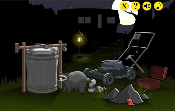 我们首先要点击路灯的电线,然后点击除草机,使路灯的电线会接在除草机上,再点除草机的开关吓走浣熊,然后点击红色工具箱、锤子,用锤子敲击垃圾桶的左上角的棍子,然后再点击一下木棍,让木棍掉落,再点击垃圾桶盖,接着点击垃圾桶倒出来的垃圾,最后点击除草机的开关,等浣熊回来之后点击浣熊。(要先藏在垃圾中在关除草机,否则会出现一个好结局)。