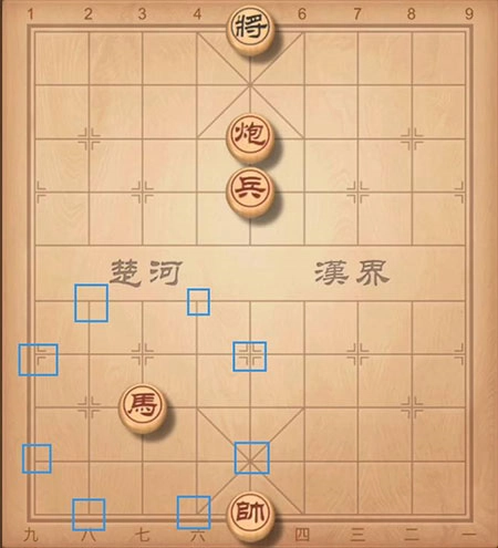 【马】的走法是“日”字形,也就是沿着“日”字的对角线行进,图里用蓝色框标注的位置,都是【马】能够到达的地方。