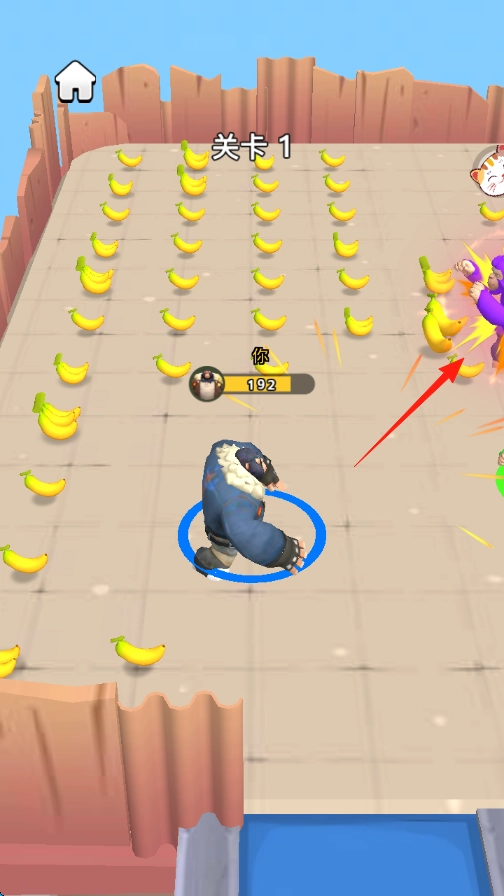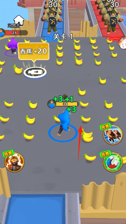 1. 踏入【关卡1】,操纵蓝色角色于遍布香蕉的区域内移动,收集香蕉以增加数量,例如【香蕉 + 20】。