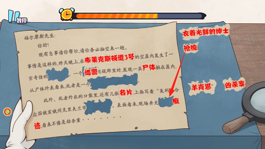 3、依次匹配词汇,完成信纸内容填充,梳理案件信息如空屋地点、发现者、死者物品等,辅助推理案件,像判断是否为劫杀案等,按此思路解开侦探推理挑战。