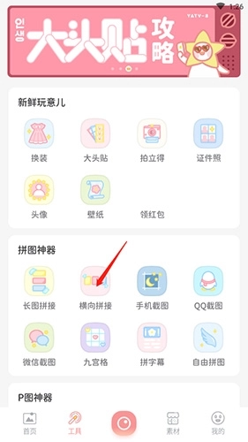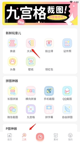打开软件后,点击底部的“工具”选项,接着选择“大头贴”选项。