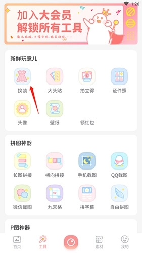 打开软件后,点击底部的“工具”选项,接着选择“换装”选项。