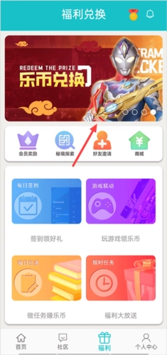在福利界面点击上方的“乐比兑换”轮播图。