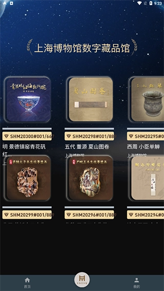 点击下方菜单栏中间的按钮,即可查看上海博物馆数字藏品馆的部分藏品展示。