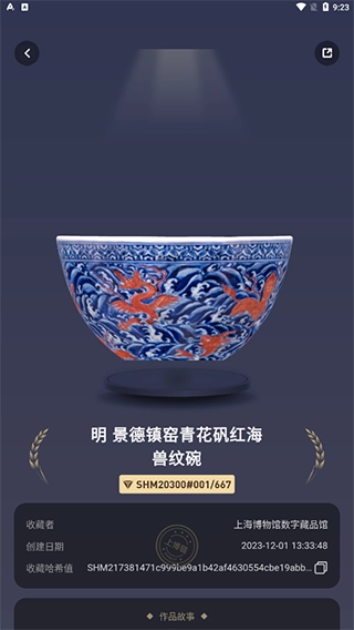 往下滑动屏幕还能了解到该数字藏品的相关背景,由于这些藏品均是以上海博物馆的实物为基础进行研发的,因此每一款都有着其独特的历史故事。