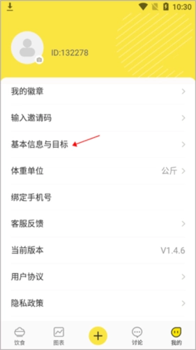 登录闪电减肥日记软件账号后,进入“我的”界面,点击“基本信息与目标”。