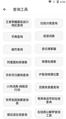 打开查询工具,就能查看王者荣耀最低战力地区,还能进行垃圾分类查询、字典查询、成语查询、缩写查询以及表情包搜索等功能。