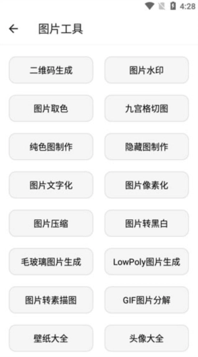图片工具包含二维码生成、图片水印添加、图片转文字、GIF图拆分、壁纸合集、头像合集等功能。