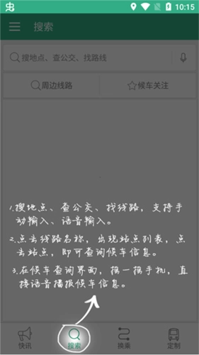 搜索地点、查公交、找绒路,支持手动输入、语音输入,点击线路名称,出现站点列表,点击站点,即可查询候车信息。