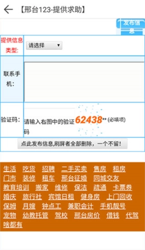 邢台123的首页设有丰富的服务分类,若需发布信息,点击相应分类即可操作。下面小编以“提供/求助”类问题为例,点击进入该分类进行演示。