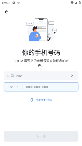 注册成功后,需通过短信验证码完成身份验证,验证通过即可启用BOTIM应用。