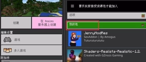 5、然后在左侧找到资源包,然后在点击右侧的“我的包”就可以看到珍妮模组,点击激活。