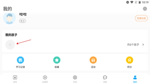打开软件完成注册登录后,进入“我的”页面,找到“我的孩子”板块,点击其下方的+号按钮。