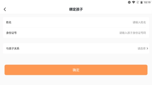进入界面后,填写孩子的姓名和身份证信息,选择您与孩子的关系,最后点击确定按钮就能完成绑定操作。