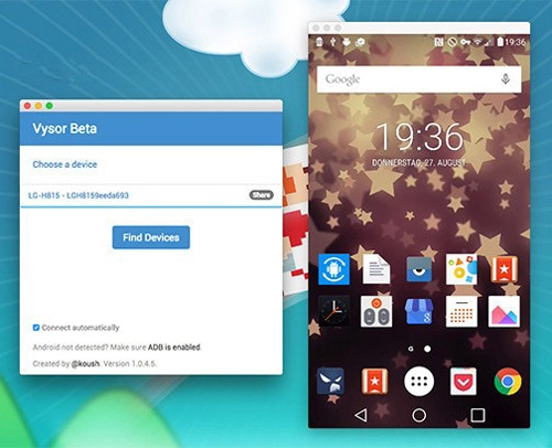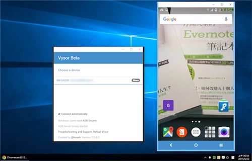 完成上述设置后,只需在电脑上打开“Vysor”这款Chrome应用,接着用USB线将Android手机与电脑相连,这样就能把手机屏幕投影到电脑上啦!