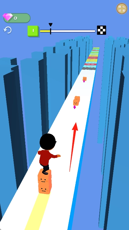 1. 游戏启动,操控红衣角色踏着方块前行,注意屏幕上方绿色进度条与钻石数量,初始值均为0。