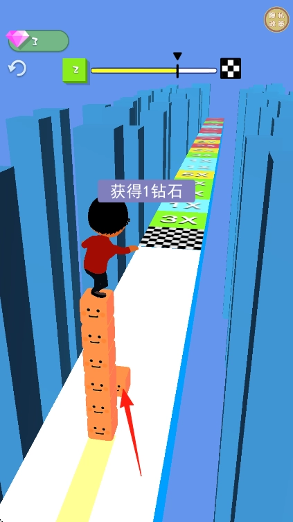 3、持续前进,让角色顺利通过终点的黑白格子区域,完成关卡,获取钻石奖励,为后续游戏做准备。