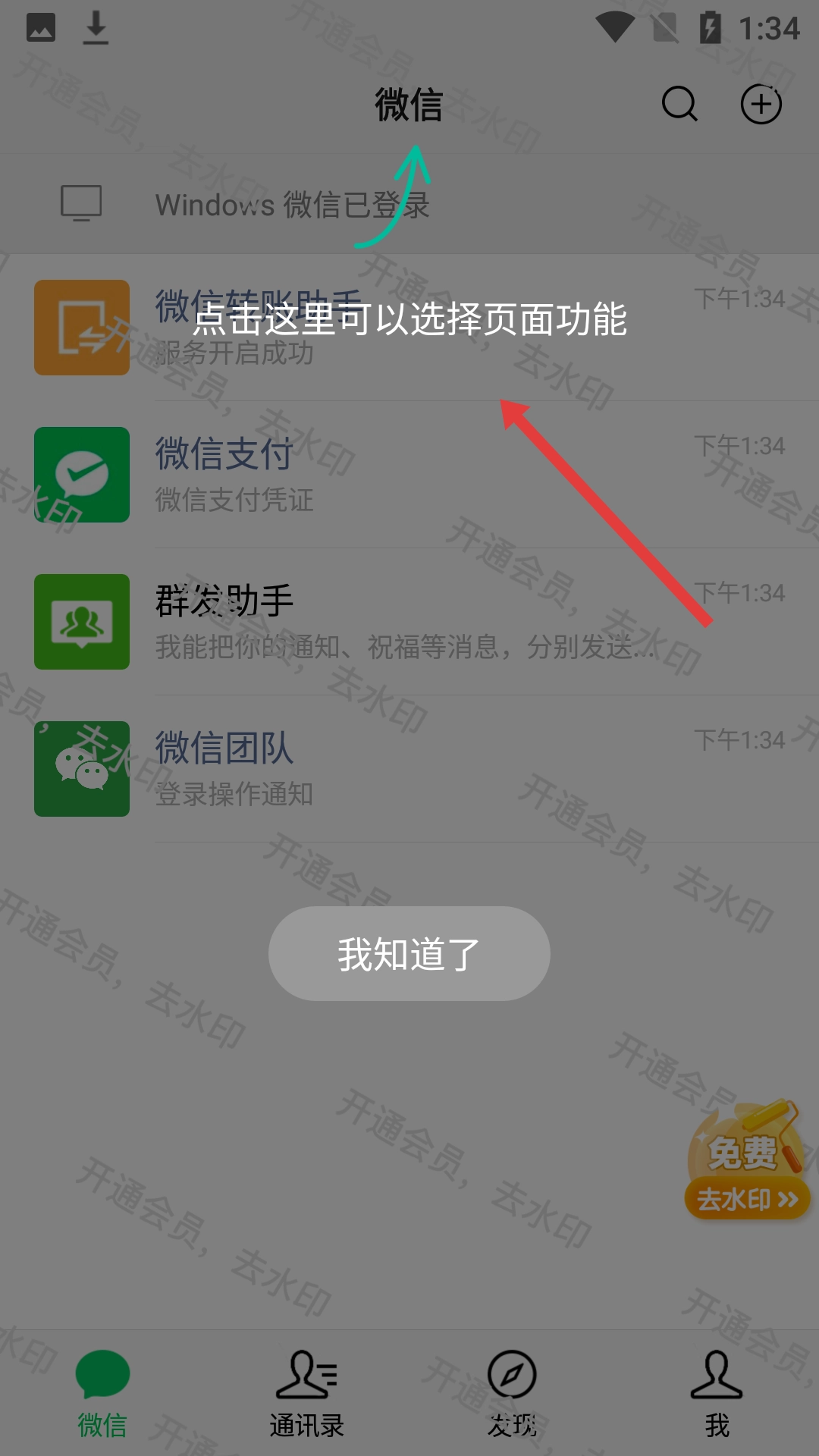 2、进入模拟微信界面后,能看到微信转账,微信支付等功能选项,页面提示点击这里可以选择页面功能,你可以根据提示去选择不同的功能,模拟使用微信的各种操作。