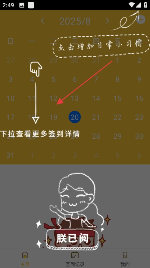 1、这个页面便捷之处在于,一眼便能掌握全月打卡状况。今天的日期被蓝色圈圈醒目地标出,点击虚线框可迅速添加新习惯。而且,那个手绘小箭头的指引十分贴心,丝毫不用担心会找不到入口。