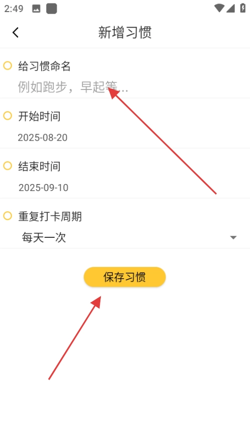 2、设置新习惯时可以自由调整时间周期,比如设成每天一次或者指定结束日期,超适合有阶段性目标的人,最棒的是命名栏有提示,纠结星人再也不怕不知道写啥好了。