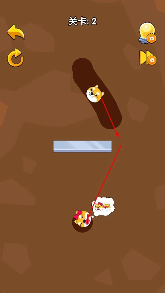 2、关卡2中,规避中间冰块障碍,绘制折线路径,让狗狗移动至目标位置相聚。