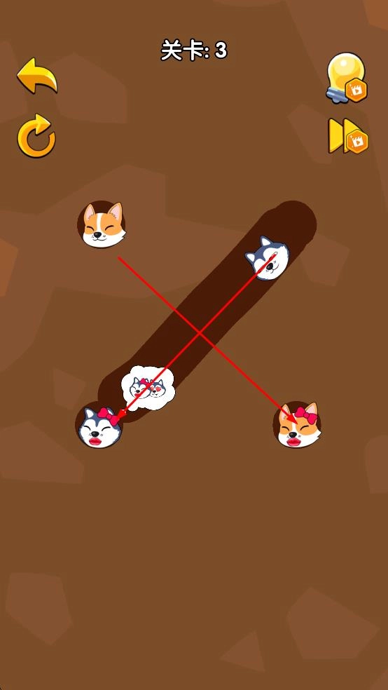 3、关卡3时,规划交叉路径,连接对应狗狗,完成多组配对,达成关卡目标。