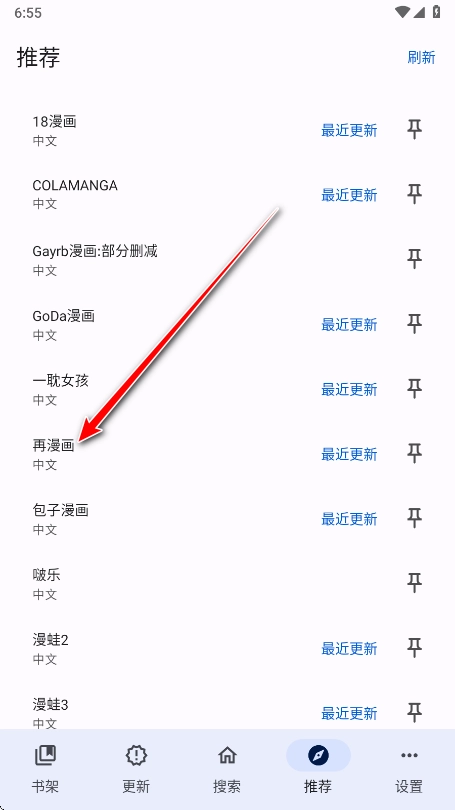 2.如下图所示,这款软件了很多漫画源,大家可以随意选择漫画源,小编以点击再漫画为例。