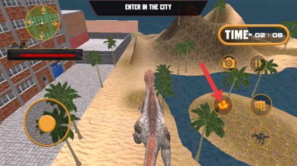 3、切换Enter In The City恐龙任务,沿沙滩-城市路径探索,遇建筑可破坏拿奖励,触发隐藏敌人及时战斗。