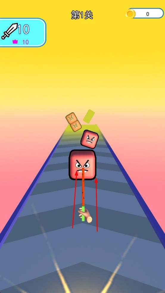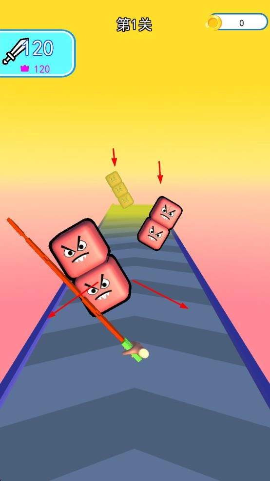 1. 踏入第1关,操纵长杆对路径上的方块状敌人发起攻击,逐步累积武器攻击数值,从而启动战斗流程。