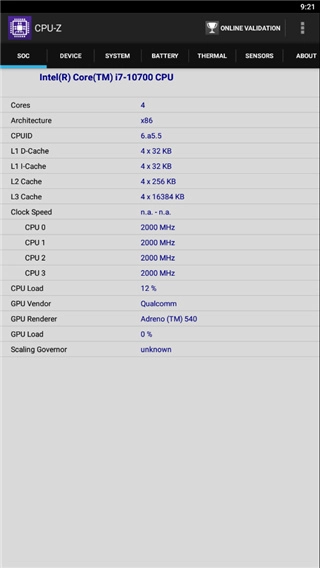 1、芯片信息显示:SOC名称、CPU、GPU、核心负载、CPU时钟频率、架构。