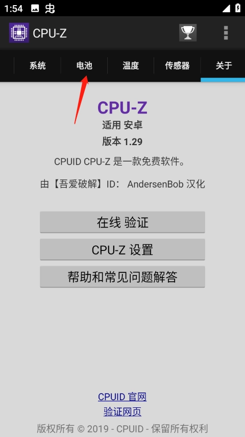 1、从本站下载CPUID CPU-Z安卓版本,开启该应用后,点击“电池”选项。