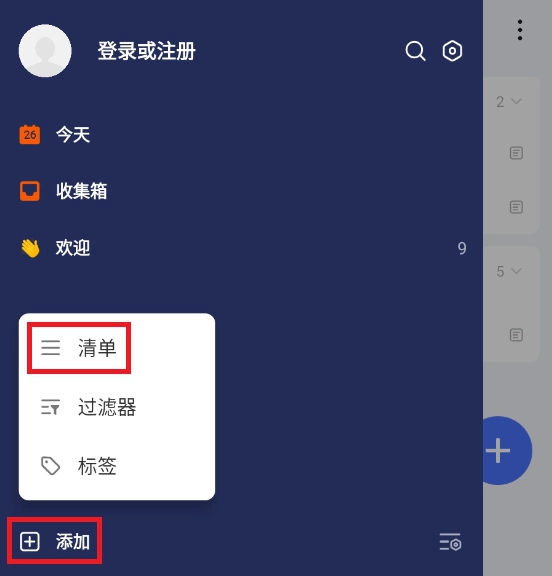 2、点击左下角+添加,选择清单选项。