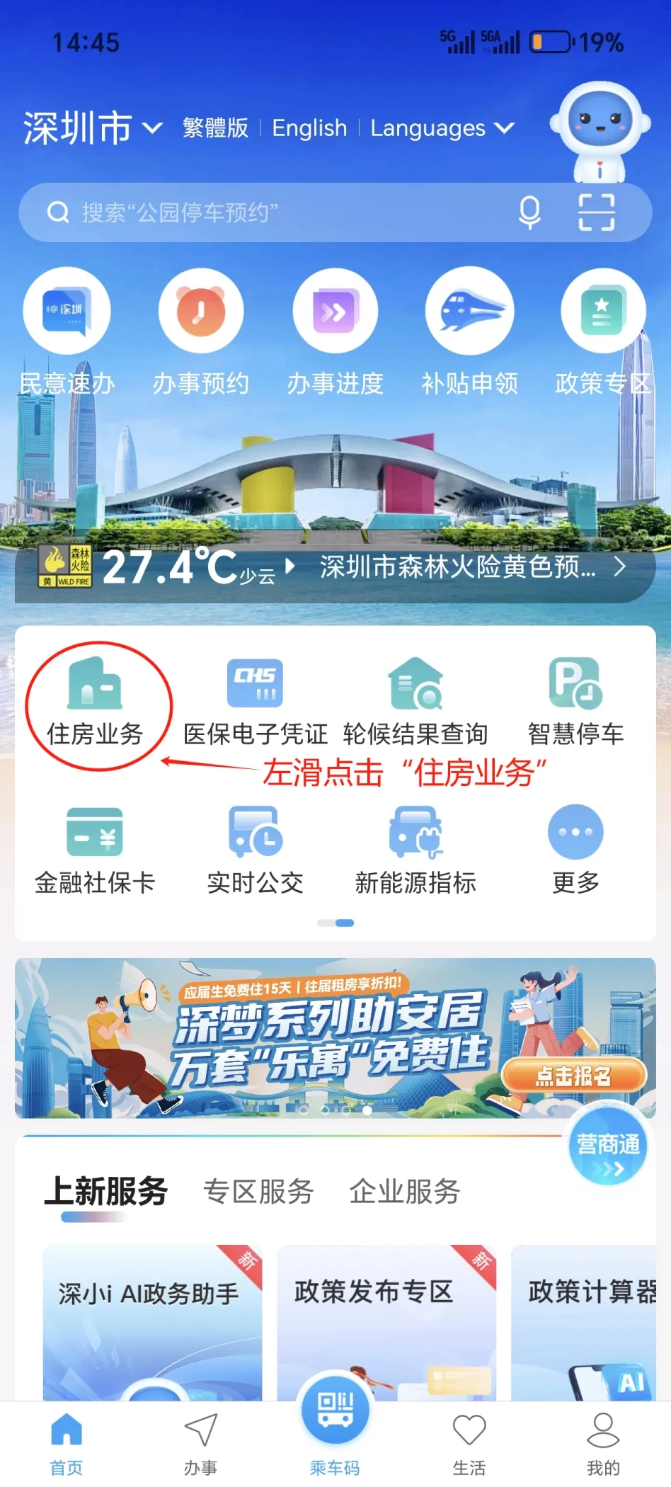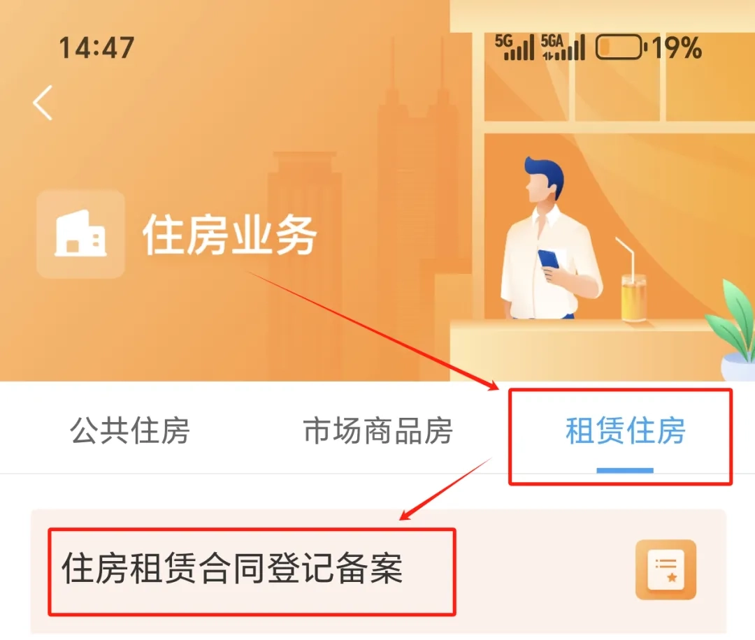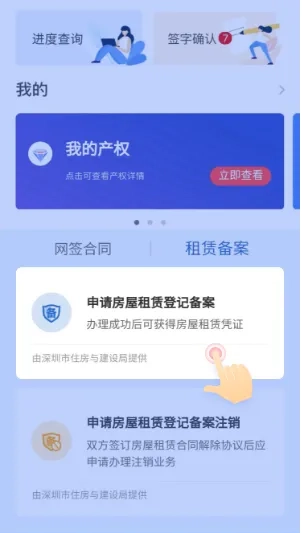 请打开“i深圳”APP,在屏幕正中间的区域,用手指从右向左滑动,随后点击“住房业务”选项。接着,在弹出的内容中选择“租赁住房”,最后点击“住房租赁合同登记备案”。