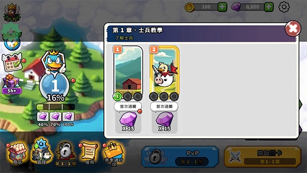 1、在游戏主界面点击关卡,选择想玩的关卡,这里以第一章第二关为例
