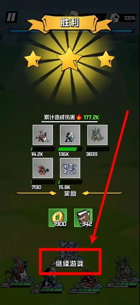 3. 当完成战斗且取得胜利后,玩家能够依据累计造成的伤害来领取金币与经验奖励,之后点击“继续游戏”,即可进入新的关卡挑战。