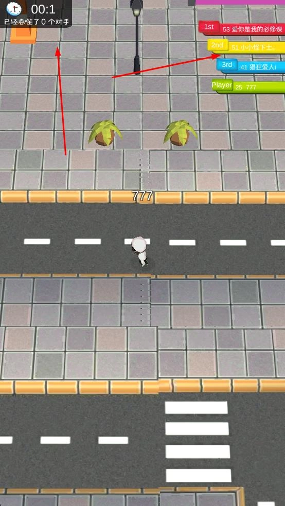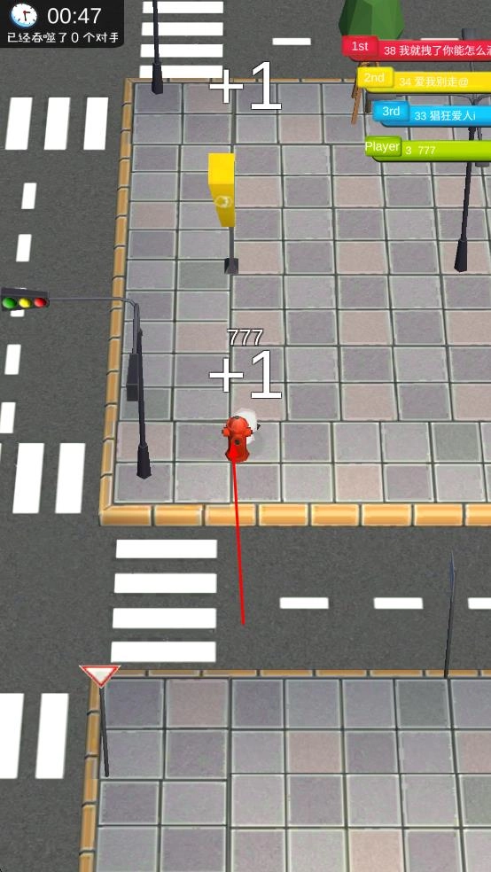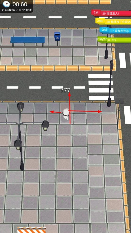 1. 当进入游戏后,对白色角色进行操控,使其在城市街道上移动,过程中吞噬路灯、消防栓之类的物体,以此来提升自身的标识数字。