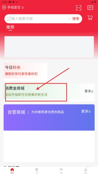 1、进入首页,点击消费金商城入口,参与活动,动动手指兑换美好生活相关商品与服务。