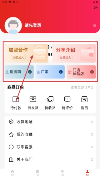 3、打开个人页,完成登录后,点击加盟合作入口,可申请加入,拓展业务或获取相关权益。