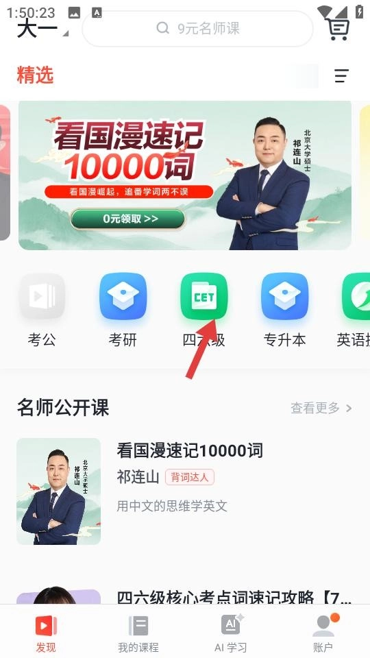 1. 首页布局一目了然,重点推荐特色课程。页面下方,考公、考研、四六级等分类图标十分醒目。名师公开课专区呈现免费优质课程,无论是语言学习,还是职业备考,多领域课程均可一键获取。