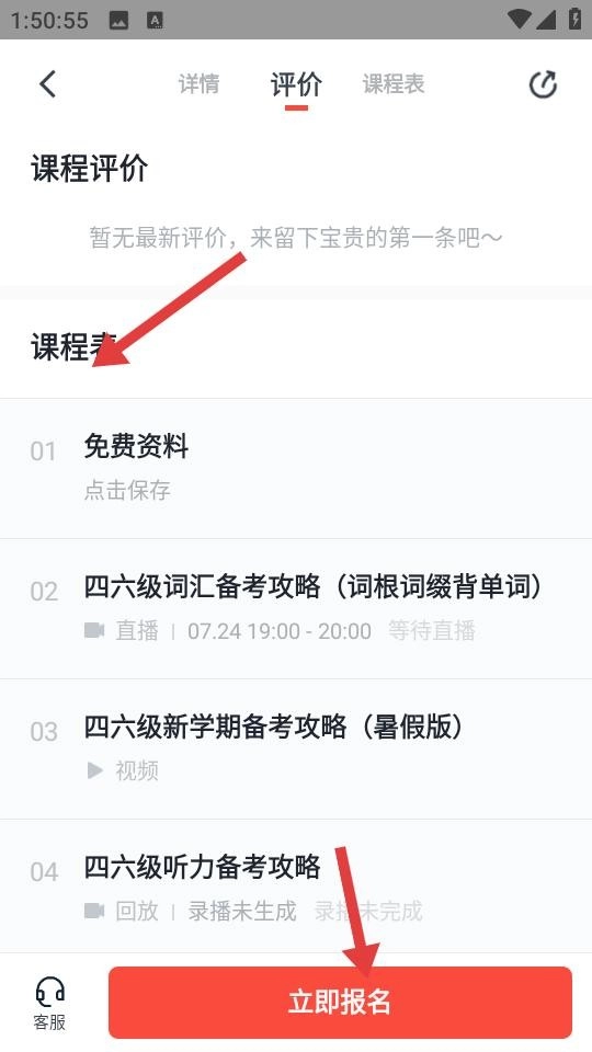 3、在课程详情页的评价区,等待用户分享自身体验。课表清晰地罗列了免费资料、直播课等内容,并标注了直播状态与时间。页面底部设有醒目的红色“立即报名”按钮,点击该按钮就能锁定学习席位。