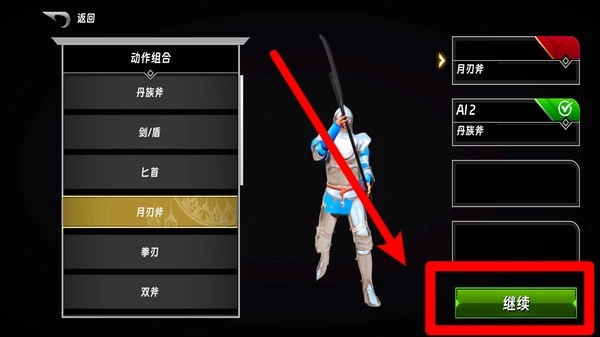 3. 在动作组合界面,玩家可自主挑选不同的武器与招式进行组合,确认无误后,点击“继续”按钮,就能投身紧张刺激的格斗战斗。