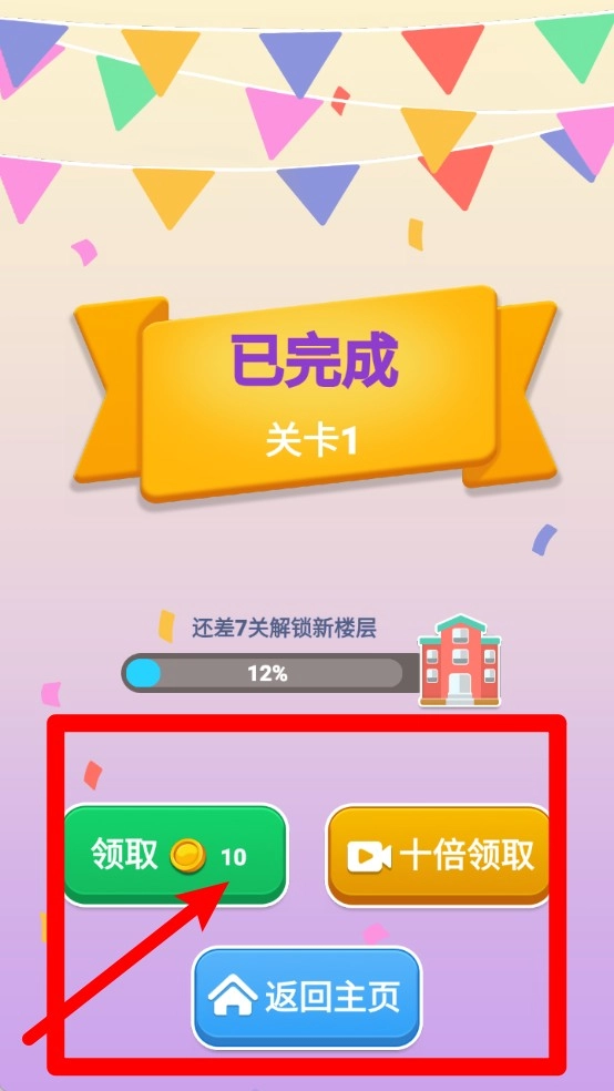 3. 当玩家完成关卡后,系统会给出通关提示。此时,玩家有两个选择,一是直接领取金币,二是观看视频,从而能够以十倍的数量领取金币,以此提升闯关的奖励收益。