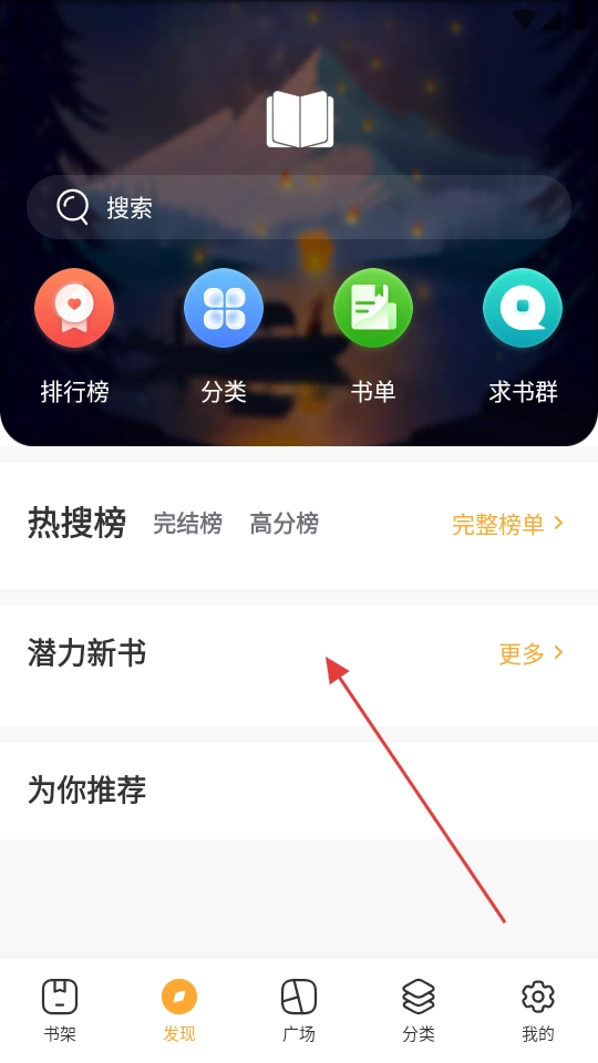 1、在这个发现页面,设有搜索框,方便你查找书籍。同时,还提供了排行榜、分类书单、求书群等功能入口。在这里,你能看到热搜榜、潜力新书以及为你推荐的内容。借助这些板块,你可以轻松发现热门书籍,或是找到适合自己的好书。