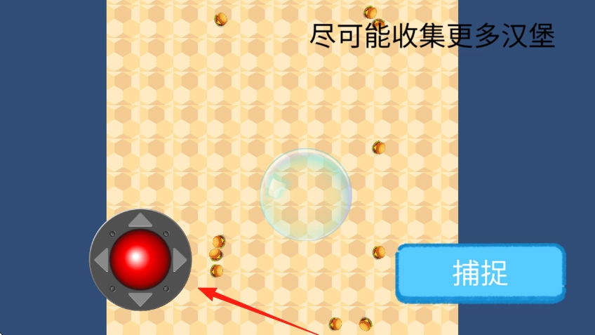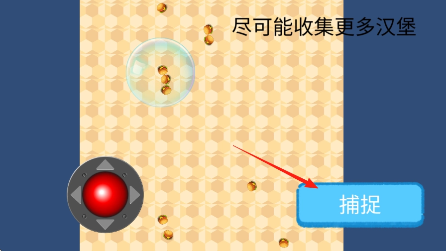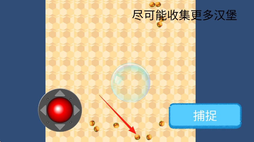 2、控制气泡在场景内移动,去收集四处散落且红箭头所指的汉堡,增加收集数量。